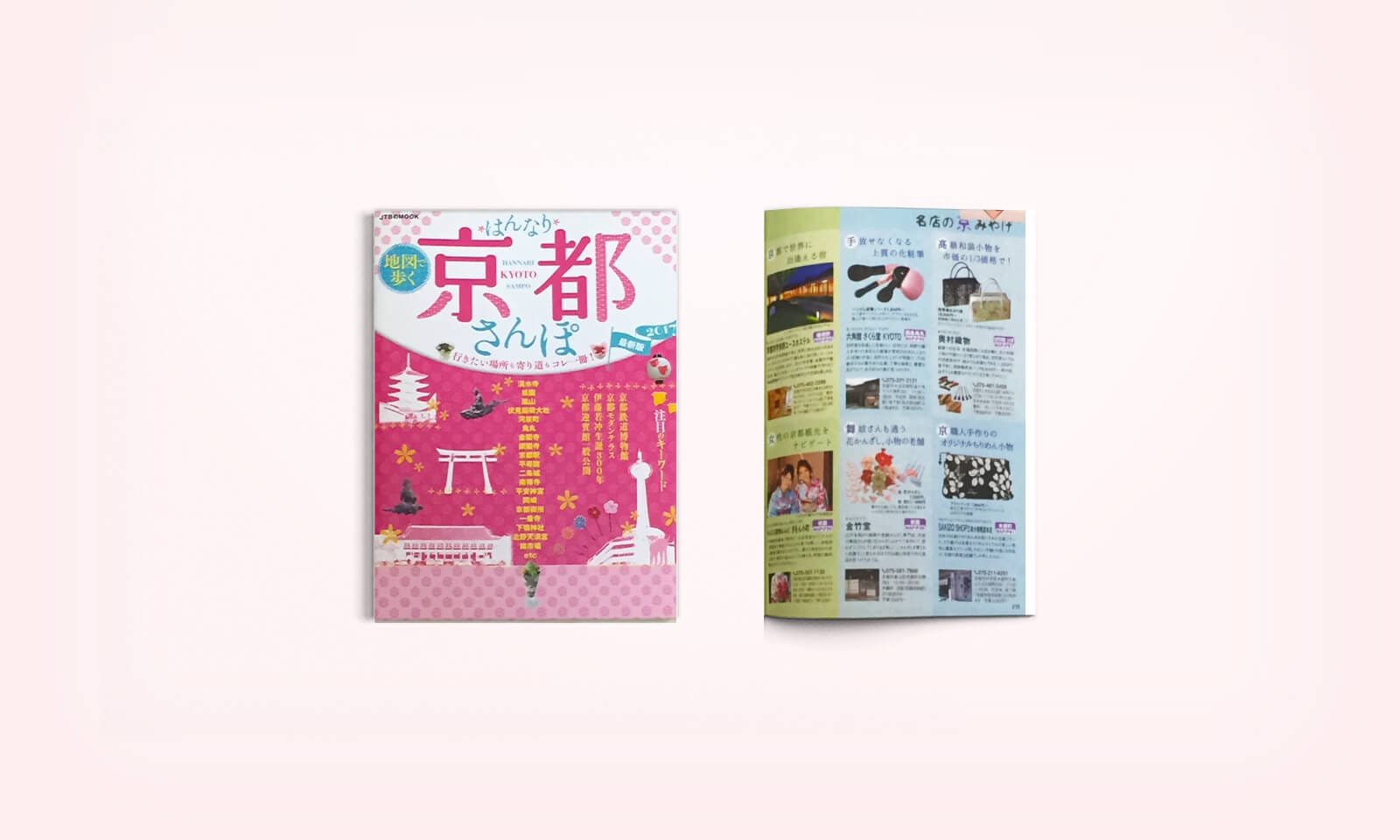 雑誌「JTBのムック 地図で歩くはんなり京都さんぽ」に掲載されました。 2016.08.19 メディア掲載情報 【雑誌名】JTBのムック 地図で歩くはんなり京都さんぽ 【掲載号】 2017年号 【発売日】2016年8月19日